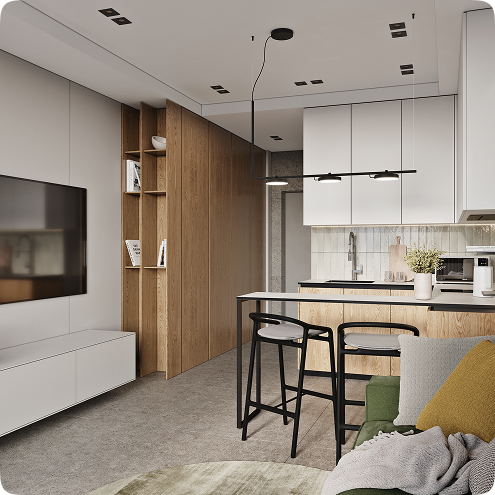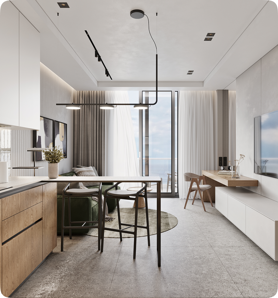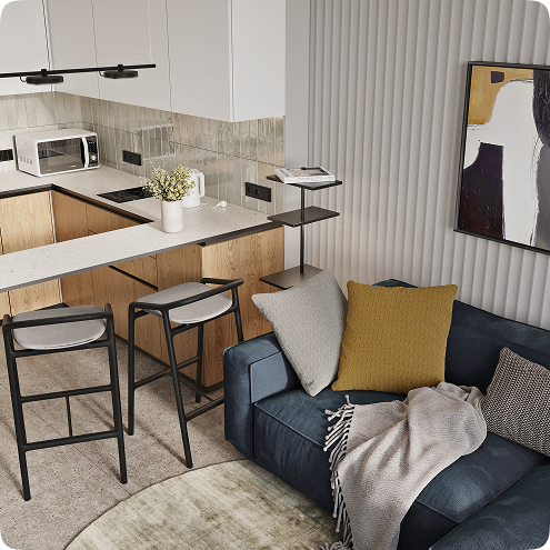 Полностью готовые к сдаче апартаменты: мебель, техника, текстиль. Покупатель экономит время, деньги и нервы. Нет шума, грязи, строек — сервис и лояльность гостей выше.